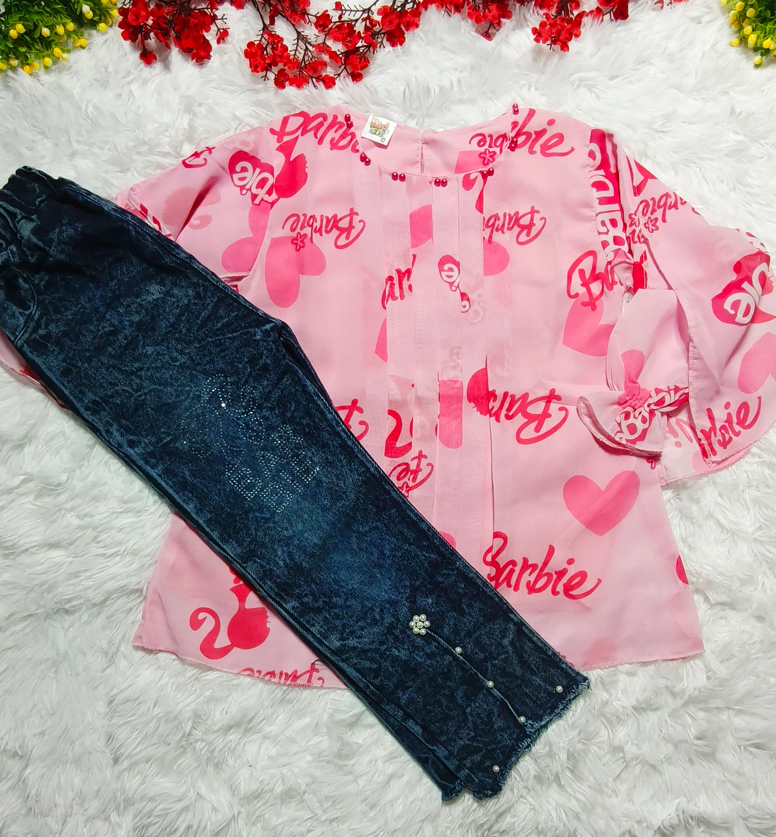 Top: Made from lightweight, breathable chiffon in a soft pink shade, featuring all-over Barbie and heart prints. Full sleeves with a comfortable fit, perfect for summer and festive occasions.