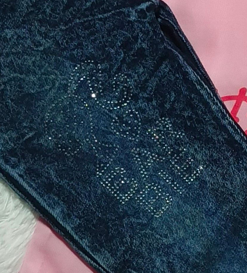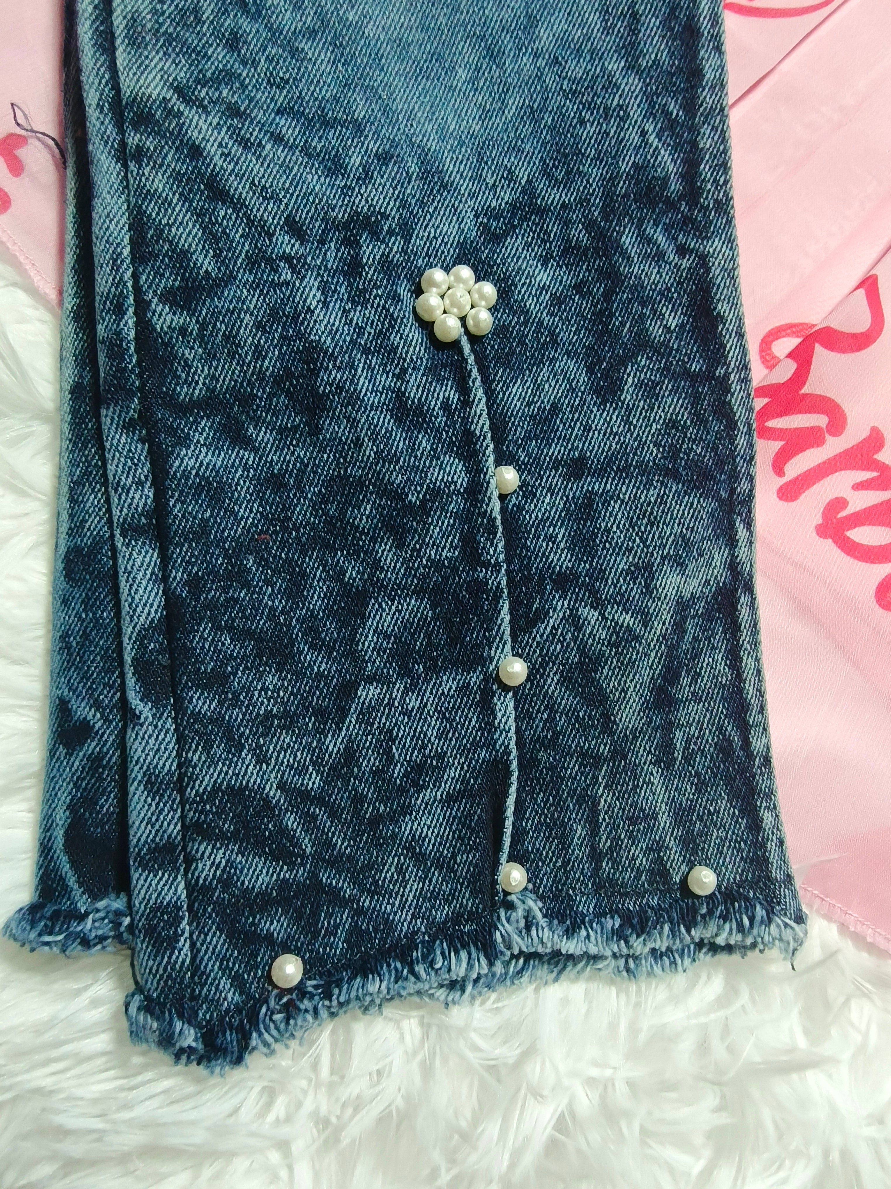 Bottom: Premium quality denim in a classic dark wash, adorned with elegant pearls and rhinestone embellishments for a fashionable look. Elastic waistband ensures comfort and easy wear.