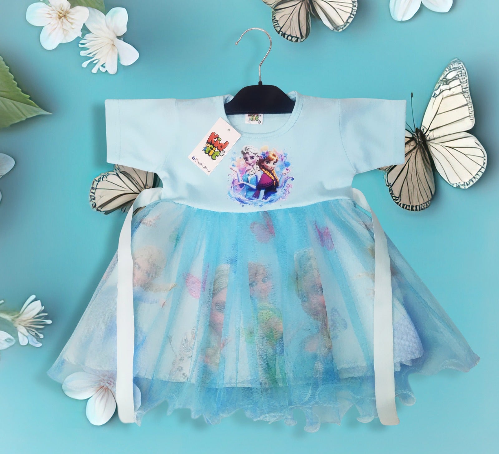 Make your little princess shine with this beautiful Frozen frock! The dress is one piece, with a soft jersey top and a net skirt attached. The inside has a smooth silk lining, so it feels gentle on your child’s skin. The cute Frozen characters on the front and skirt make it extra special!